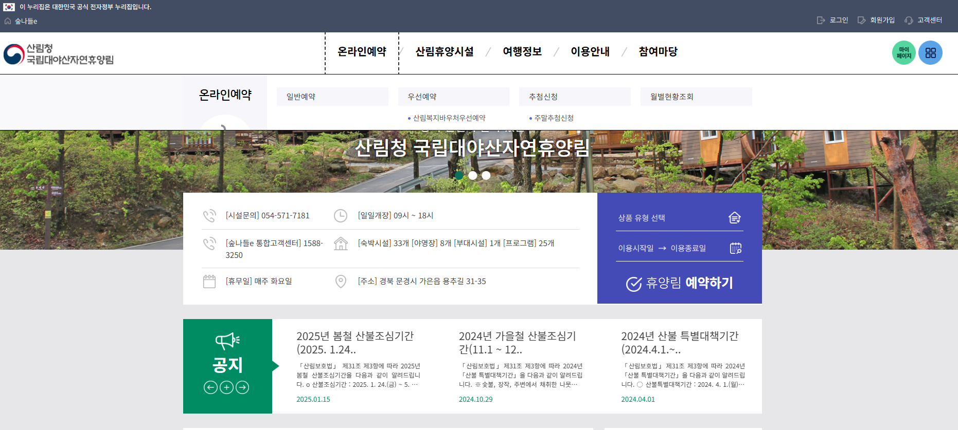 2025년 국립자연휴양림 성수기 예약 안내2025년 여름 성수기(7월 15일~8월 24일) 국립자연휴양림 예약은 추첨제로 진행됩니다. 예약은 숲나들e 누리집에서 신청할 수 있으며, 자세한 일정은 매년 5월